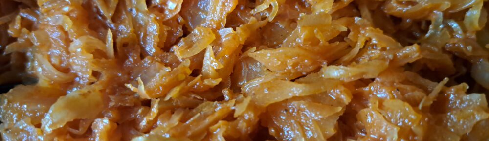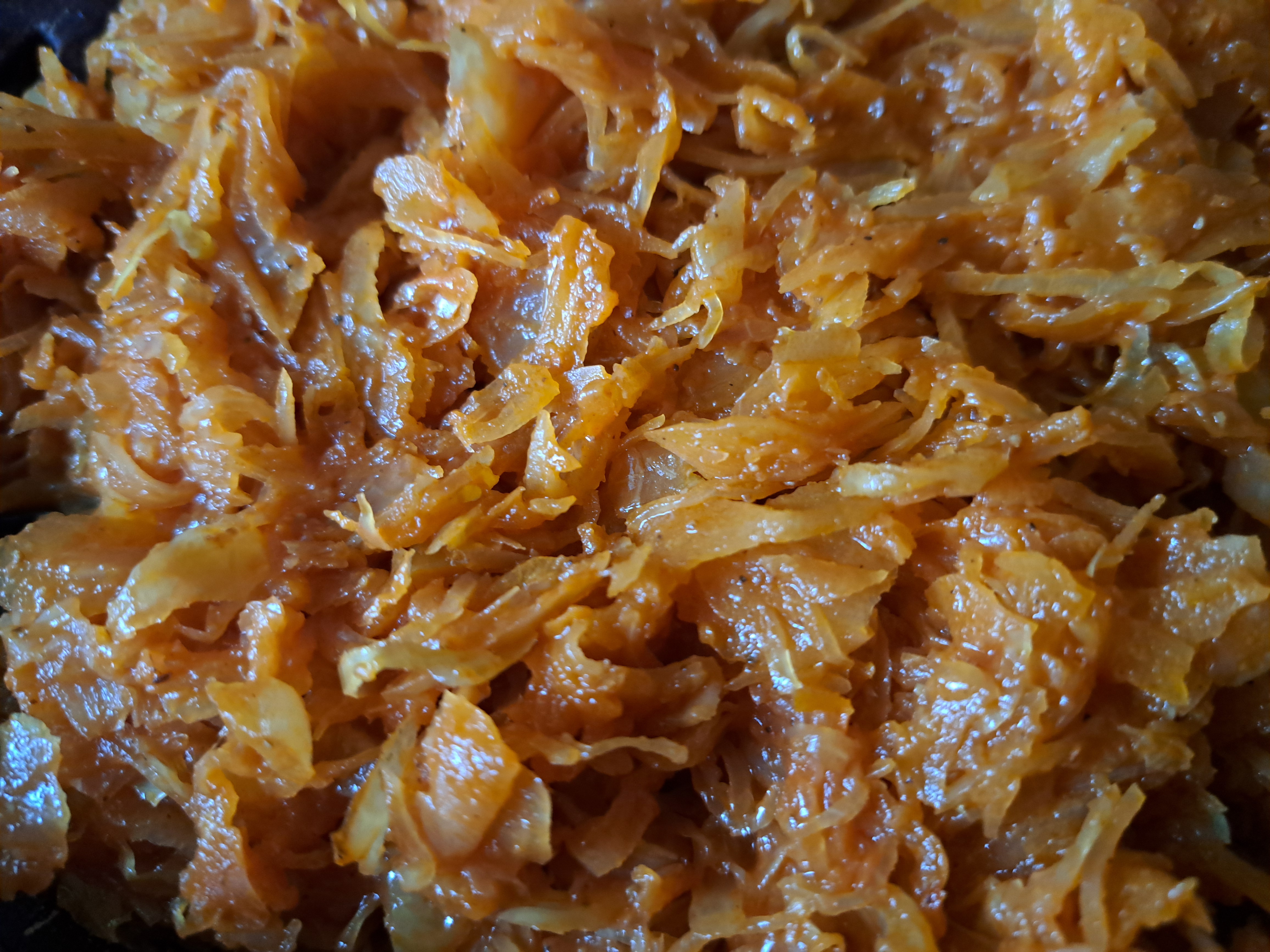 Dziś proponuję kapustę zasmażoną z dodatkiem soku pomidorowego. Taka kapusta stanowi doskonały dodatek do obiadu, ale też może stanowić samodzielne danie i też będzie wyśmienicie smakować.