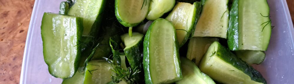 Trochę przypominają te, które już robiłam /patrz Ogórki gruntowe małosolne – rosyjska metoda na sucho/, ale te są z dodatkiem octu i oleju, stąd nazwałam je a’la małosolne.