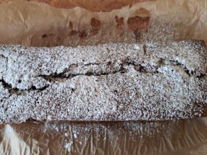 Ciasto przelać do foremki wyłożonej papierem do pieczenia. Na wierzchu ułożyć połówkę banana i oprószyć go lekko cukrem trzcinowym.