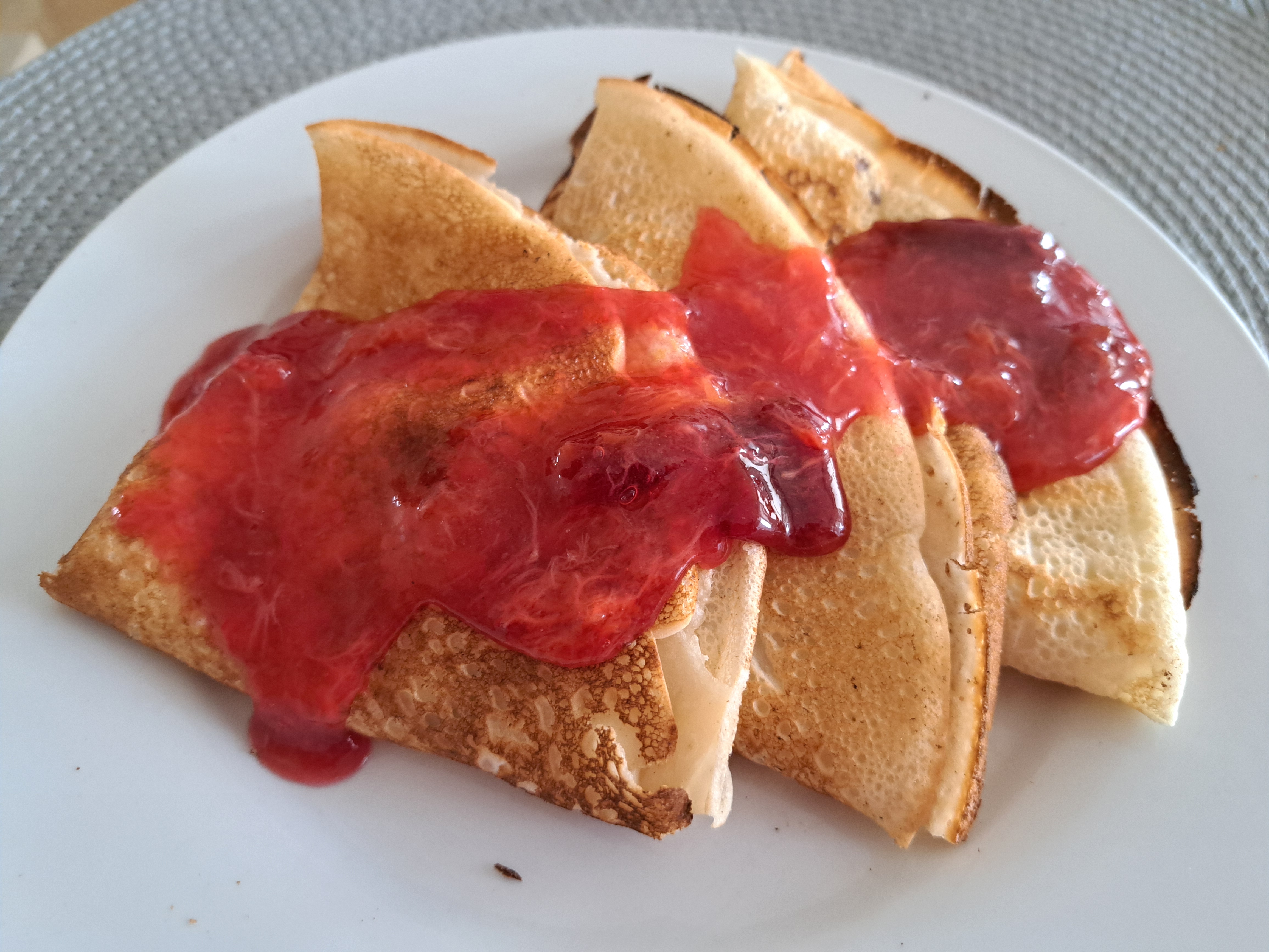 Każdy naleśnik posmarować serem, złożyć w tzw. chusteczkę i ułożyć na talerzu. Polać sosem śliwkowym i … zajadać.