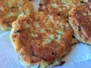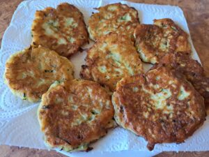 Cukinię umyć, nie obierać, zetrzeć  na dużych oczkach, nadmiar soku odcisnąć.