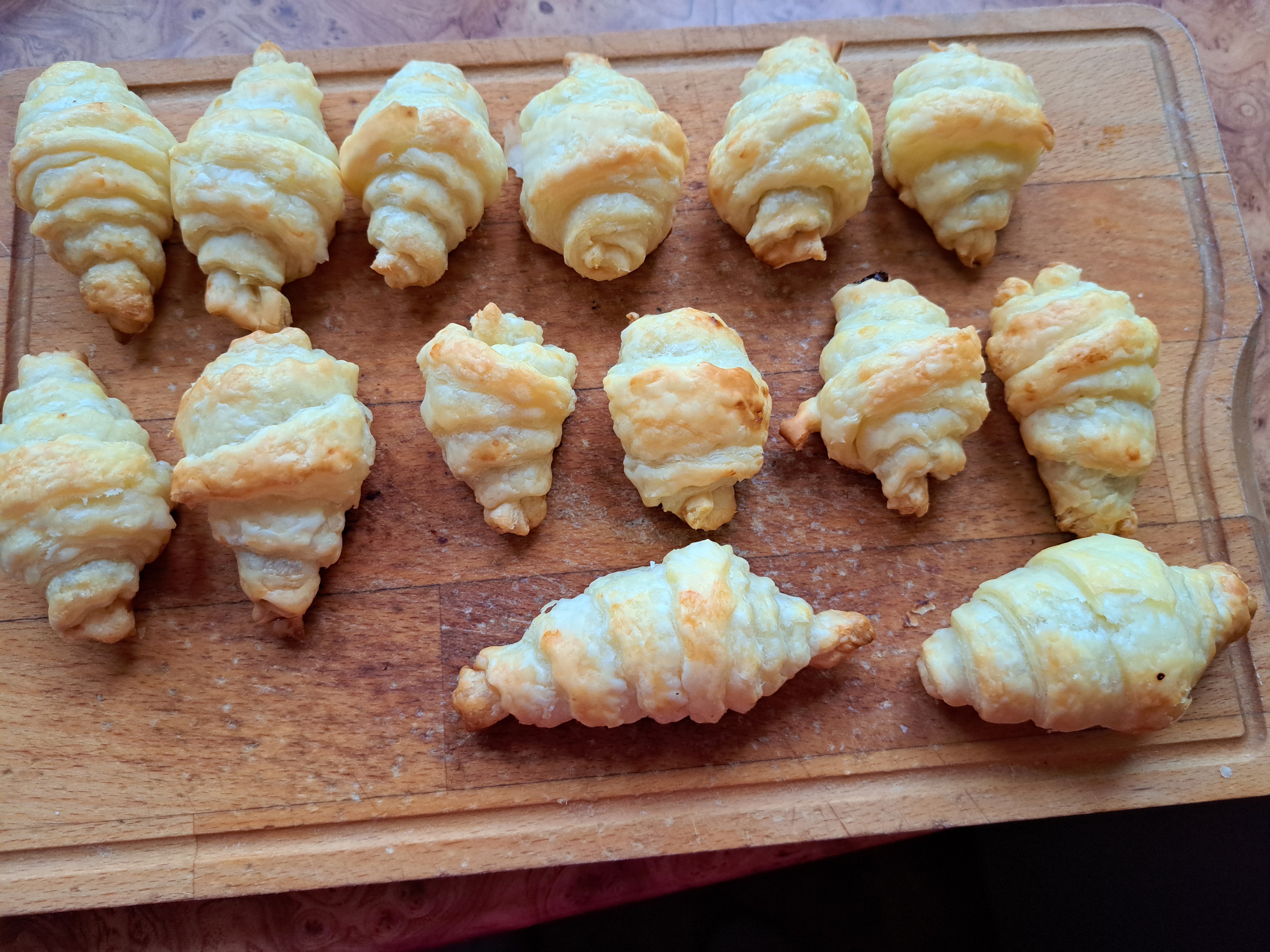 Płat ciasta francuskiego rozwijamy na desce, następnie dzielimy go na trójkąty. W zależności jak duże będą rogaliki, trójkąty wycinamy z całego płata bądź też przecinamy płat przez środek wzdłuż dłuższego boku i i dopiero z tych dwu pasów wykrawamy trójkąciki.