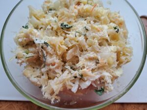 Kapustę odcisnąć z nadmiaru soku i pokroić na drobniej.