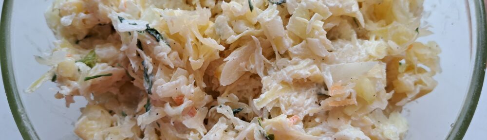 Bez przekonania podchodziłam do połączenia kapusty kiszonej ze śmietaną, ale okazało się, że niesłusznie. Surówka wyszła w mojej ocenie pierwsza klasa, smak niespodziewany i zaskakujący i nadaje się do wszystkiego. Dziś podałam ją do ryby i zajadałam, aż mi się uszy trzęsły.