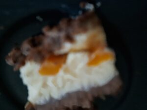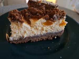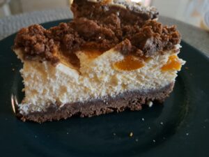 Masę serową wylać na kakaowy spód, wyrównać, na wierzch wyłożyć brzoskwinie dobrze wcześniej osączone i pokrojone w kostkę.