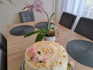 Ciasto wylać do formy wyłożonej papierem do pieczenia i piec w temp. 175ºC przez ok. 40 – 45 minut do tzw. suchego patyczka. Wystudzone ciasto przekroić na trzy części. Przed smarowaniem kremem każdy blat lekko nasączyć.