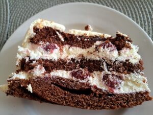 Masą przełożyć nasączone blaty biszkoptu, posmarowane uprzednio cienką warstwą dżemu. W masę powtykać osączone wiśnie, ewentualnie oprószyć startą czekoladą.. Można trochę masy odłożyć do dekoracji, np. do zrobienia rozetek. Tort odstawić do lodówki celem stężenia masy.