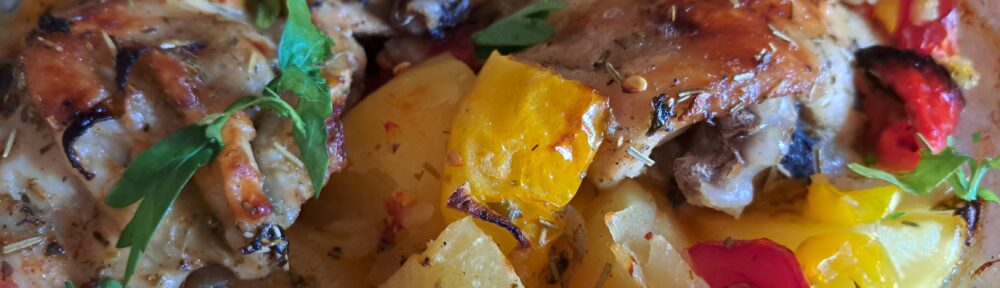 Dziś polecam dość leniwy obiad, a mianowicie udka kurczaka zapiekane z ziemniakami oraz dodatkiem warzyw, które można dowolnie komponować…. u mnie tym razem będzie papryka i pomidor. Danie robi się prawie samo, a smakuje… mniam, mniam…